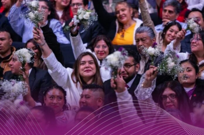 La ceremonia, titulada “El Amor Transforma y Construye Comunidad”, fue encabezada por la jefa de Gobierno, Clara Brugada Molina, quien fungió como testigo principal de las uniones y dirigió un mensaje a las y los contrayentes.