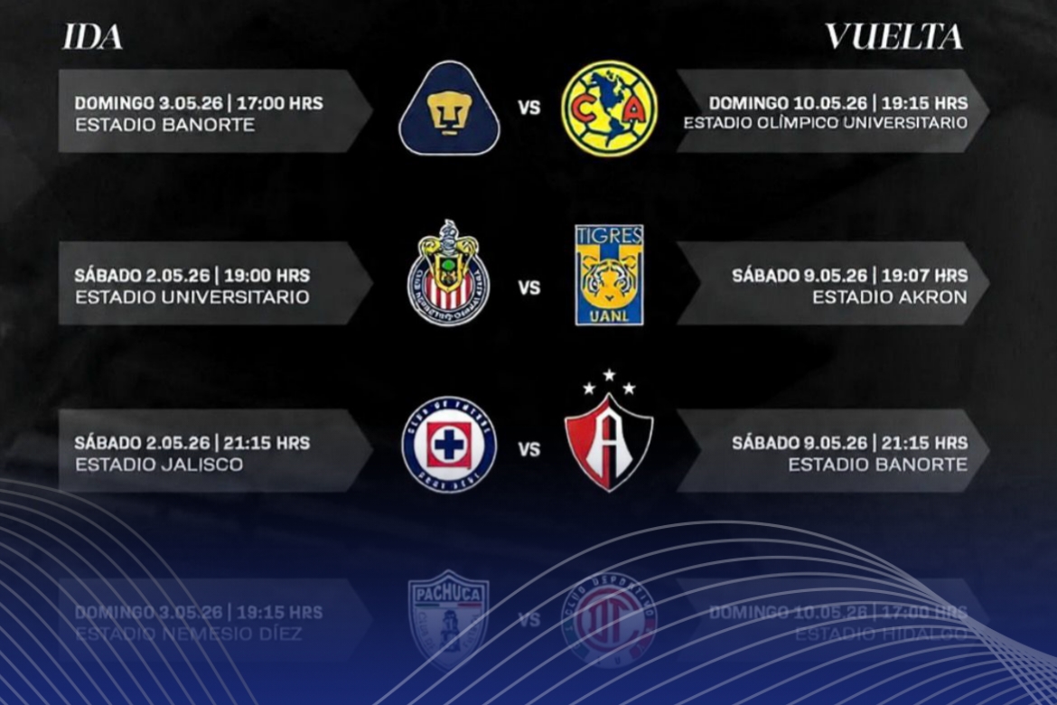 El cruce más destacado enfrenta a Pumas, líder de la tabla, contra América, que avanzó en la última posición. El partido de ida se jugará el sábado 2 de mayo en el Estadio Banorte, mientras que la vuelta se disputará el 9 de mayo en el Estadio Olímpico Universitario.