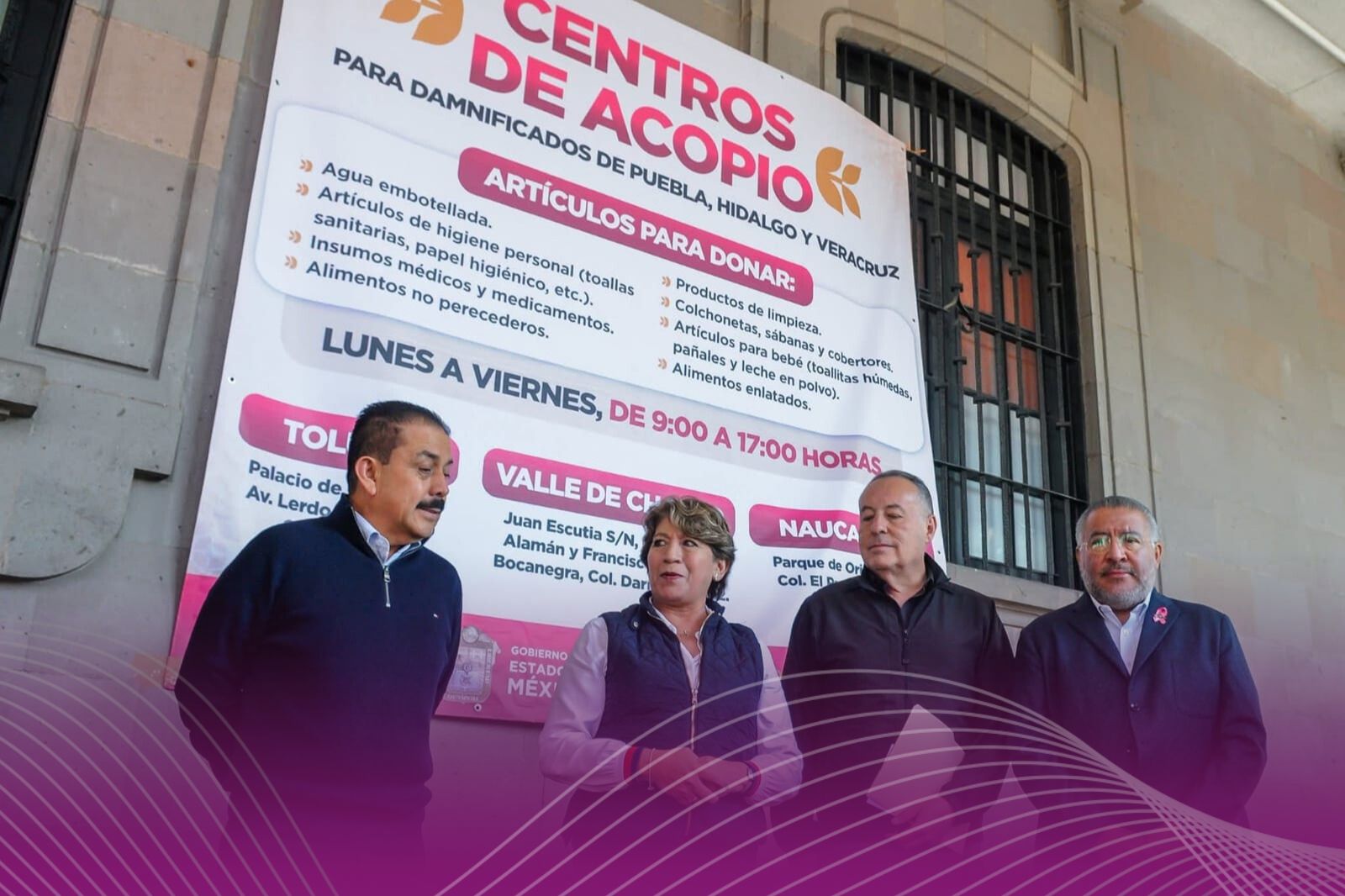 Actualmente el Gobierno del Estado de México mantiene habilitados cuatro Centros de Acopio: Palacio de Gobierno (capital mexiquense), DIFEM (Paseo Colón y Tollocan), y las Oficinas de Protección Civil en Naucalpan y Valle de Chalco, los cuales permanecen abiertos de lunes a viernes de 9:00 a 17:00 horas.