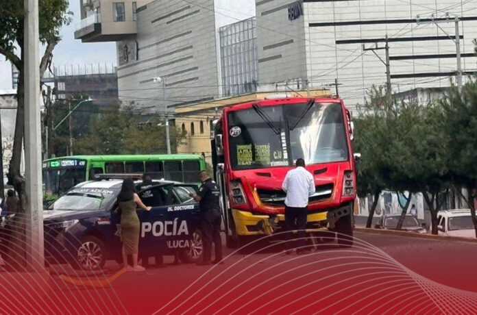 Y es que el chofer de la unidad del transporte público por alguna razón perdió el control hasta chocar contra la parte trasera de una patrulla de la Policía Municipal de Toluca.