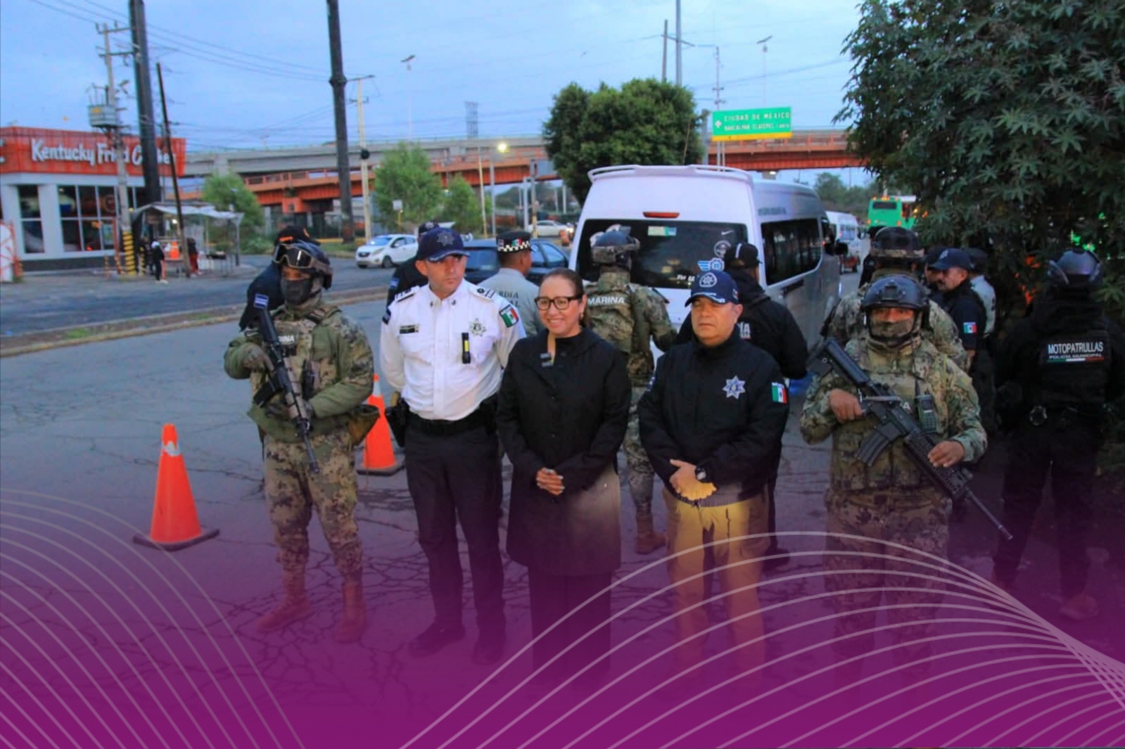 En la avenida Jardines de Morelos, la presidenta municipal encabezó la supervisión de un despliegue integrado por elementos de Seguridad Municipal, Policía de Género, Tránsito, Marina, Sedena y Guardia Nacional. El dispositivo contempló filtros para detener unidades de transporte público, realizar revisiones a pasajeros y detectar armas con apoyo de la Unidad Canina.