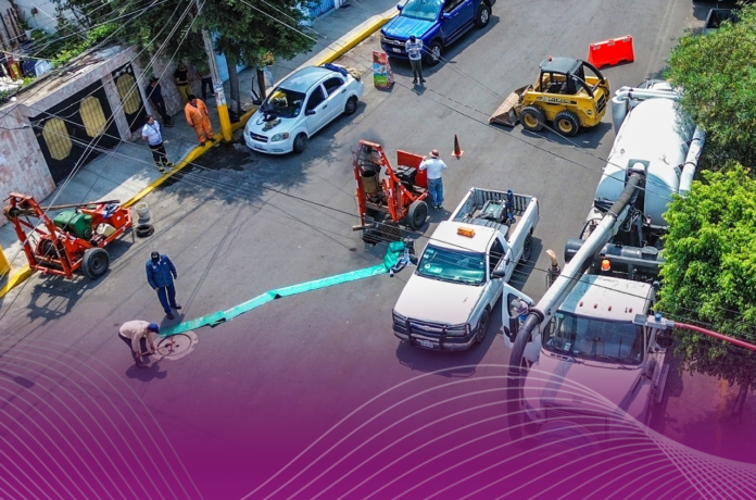 Para el desazolve del colector se utiliza un esquema mixto que combina labores manuales con equipo especializado, entre ellos unidades hidroneumáticas de presión-succión, malacates motorizados y equipos de bombeo que permiten retirar sedimentos y materiales que obstruyen el flujo del sistema de drenaje.