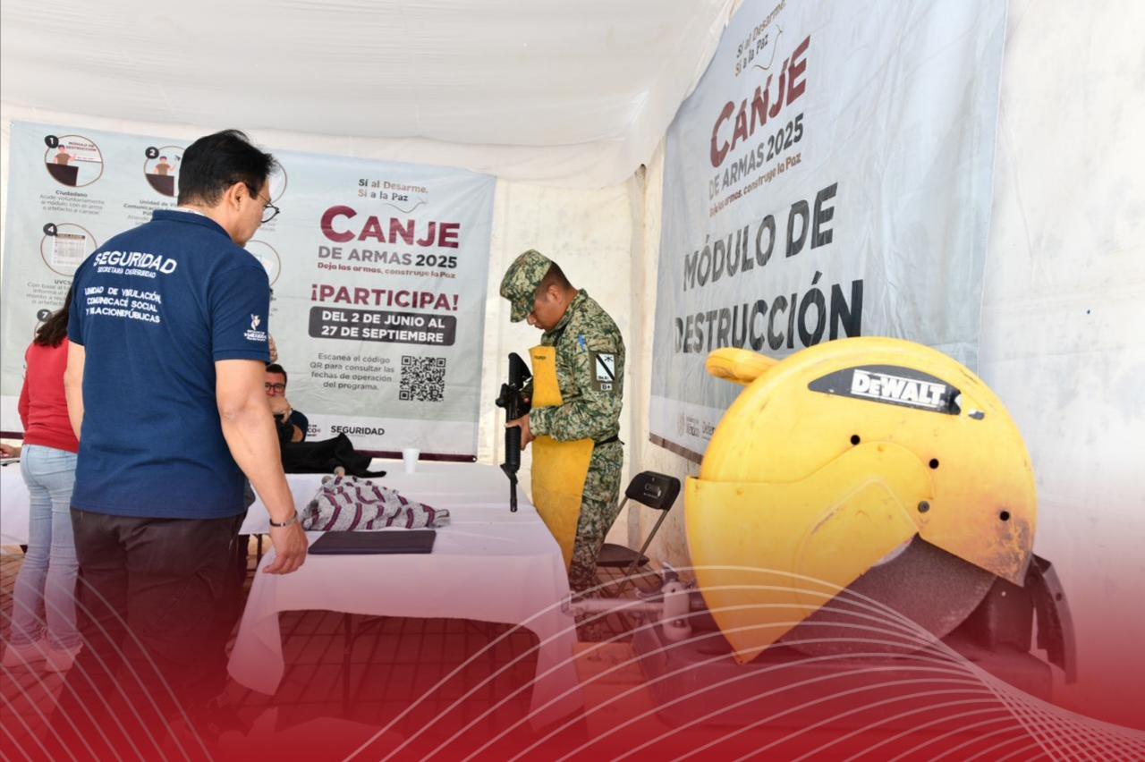 Las Secretarías de Seguridad del Estado de México (SSEM), de la Defensa Nacional (Defensa) y Ayuntamientos continúan con la suma de esfuerzos en beneficio de las y los mexiquenses con la aplicación del programa Canje de Armas 2025. A la fecha se han destruido 826 armas, 68 mil 750 municiones y 140 granadas.