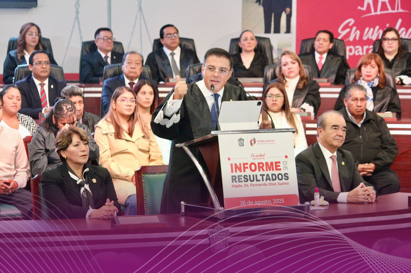 El presidente del Tribunal Superior de Justicia del Estado de México (TSJEM), Fernando Díaz Juárez, presentó su Informe de Resultados ante representantes de los tres poderes del Estado, legisladores locales, magistradas y magistrados, donde aseguró que la transformación del Poder Judicial mexiquense ya es tangible y responde a la exigencia ciudadana de contar con una justicia más cercana, imparcial y libre de prácticas de corrupción, clasismo y nepotismo.