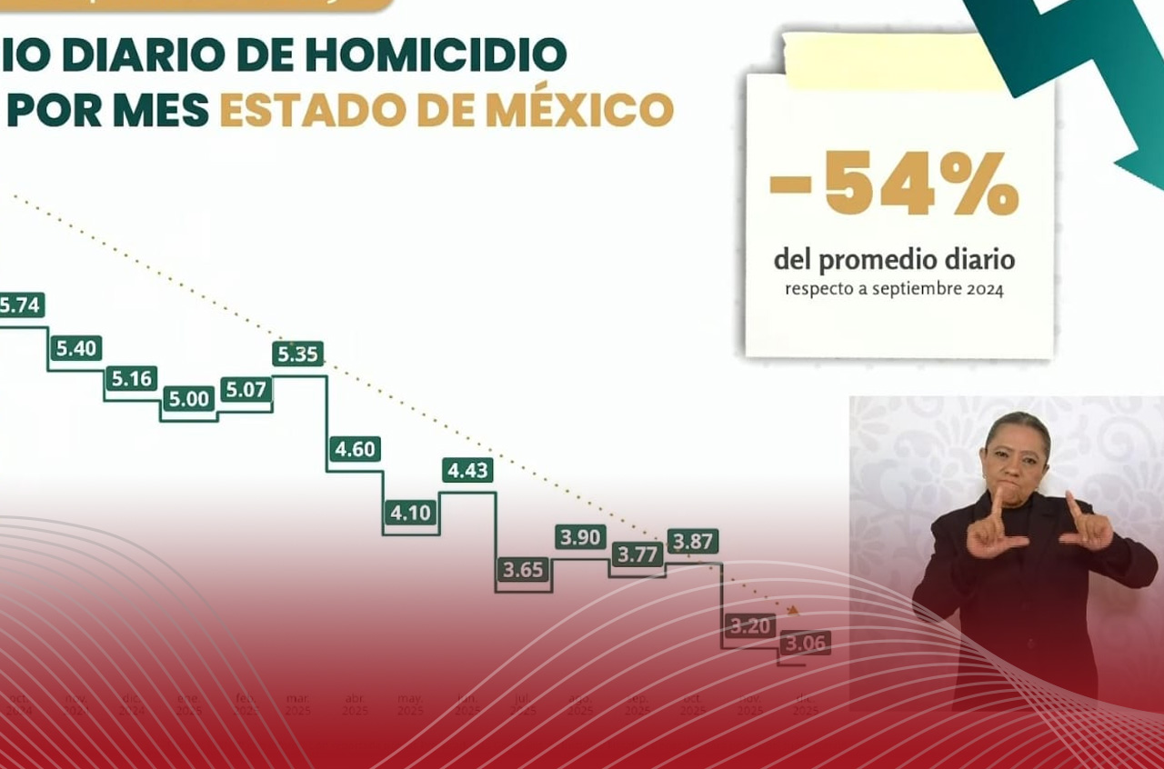 Al cierre de 2025, el Estado de México registró una disminución acumulada del 54% en homicidios dolosos, al reducir el promedio diario de 6.63 víctimas en septiembre de 2024 a 3.06 en diciembre de 2025, siendo este último el mes con la incidencia más baja del periodo.