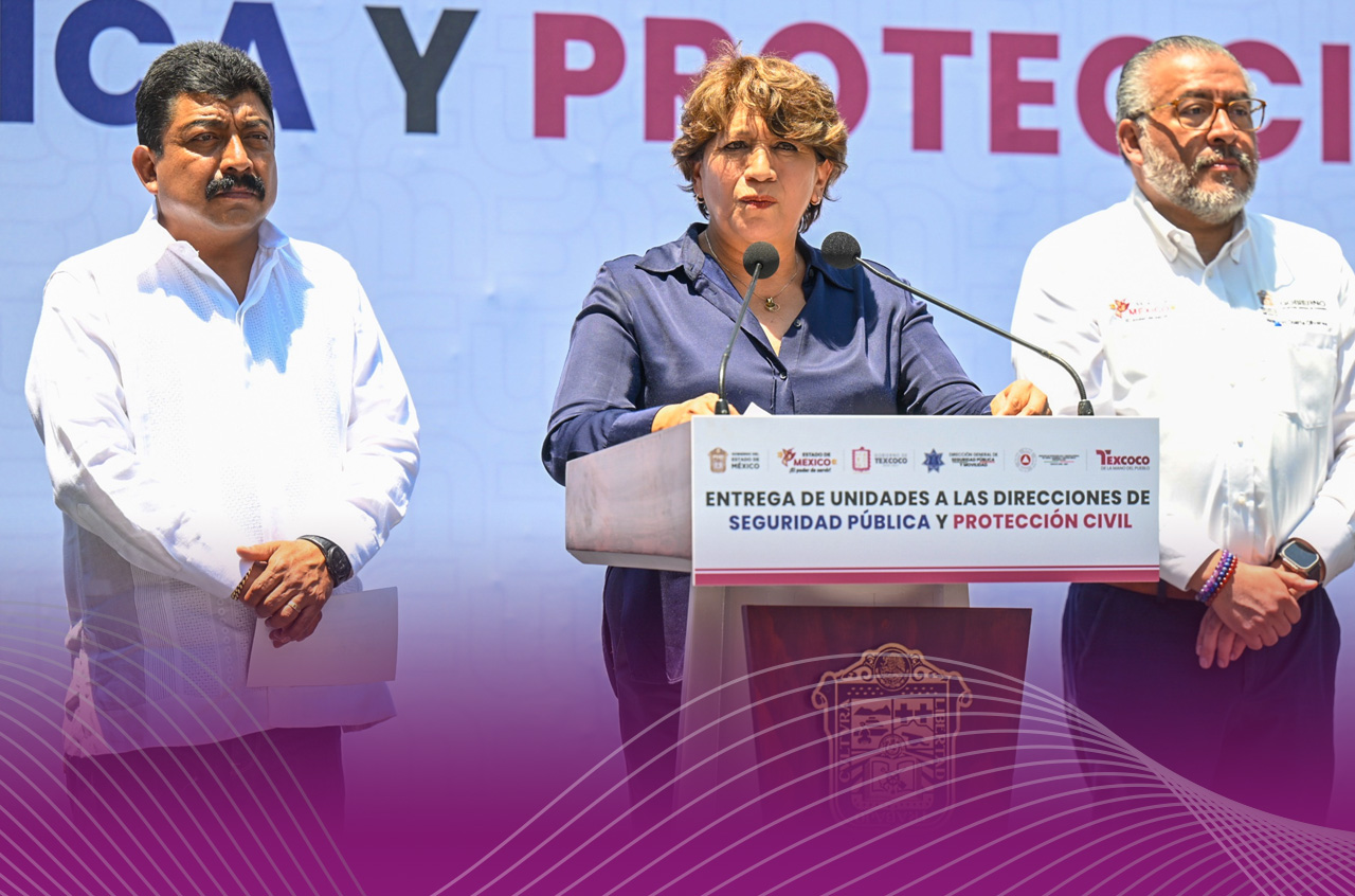 “Hoy estamos aquí en lo que considero mi casa, Texcoco, para entregar 35 nuevas patrullas y cinco unidades de Protección Civil que van a seguir fortaleciendo el trabajo de las y los servidores públicos que nos protegen”, señaló la mandataria.