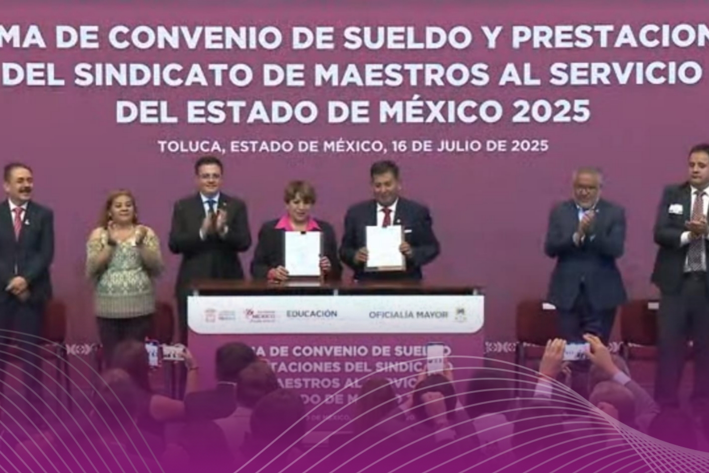 El Gobierno del Estado de México y el Sindicato de Maestros al Servicio del Estado de México (SMSEM) signaron el Convenio de Sueldo y Prestaciones 2025, dando respuesta al Pliego Petitorio que en abril pasado presentaron y que contiene 62 cláusulas que encierran las necesidades del magisterio.