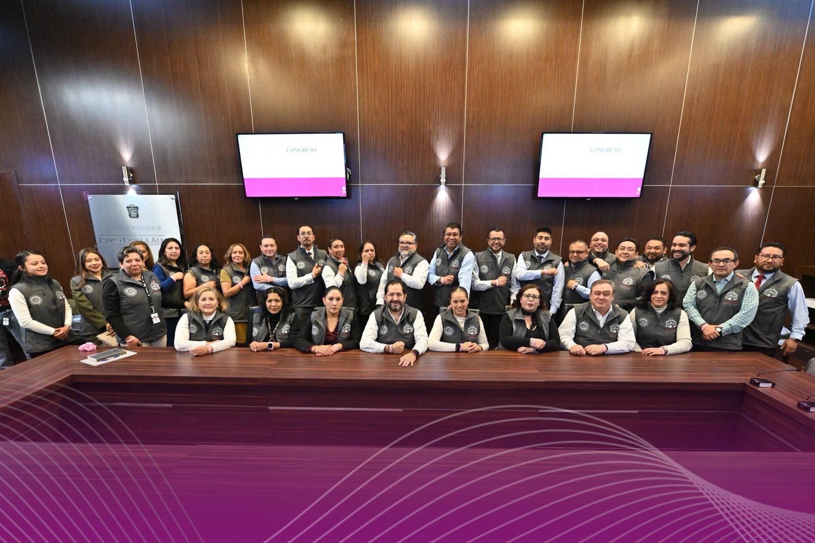 El diputado José Francisco Vázquez Rodríguez, presidente de la Junta de Coordinación Política, y Bedelia Guevara González, presidenta del Voluntariado de la LXII Legislatura del Estado de México, encabezaron la entrega de chalecos al personal del Congreso estatal con el propósito de fortalecer el sentido de identidad y pertenencia institucional.