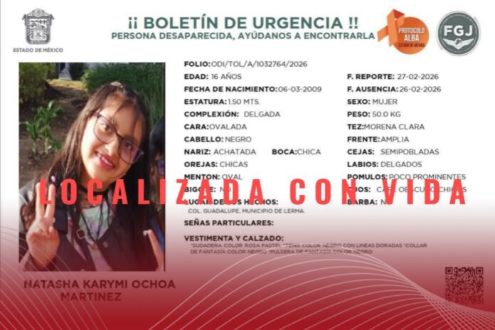 Natasha Karymi Ochoa Martínez, estudiante de 16 años que había sido reportada como desaparecida en el municipio de Lerma, fue localizada con vida y ya se encuentra nuevamente con su familia, informaron sus padres.
