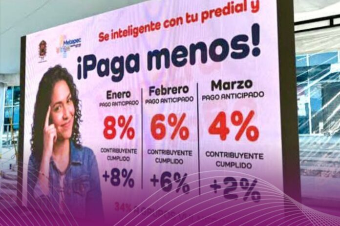 «Durante enero se aplica un 8 por ciento de descuento por pago anticipado, más un 8 por ciento adicional para contribuyentes cumplidos; en febrero el beneficio es del 6 por ciento más 6 por ciento, y en marzo del 4 por ciento más 2 por ciento», indicó.