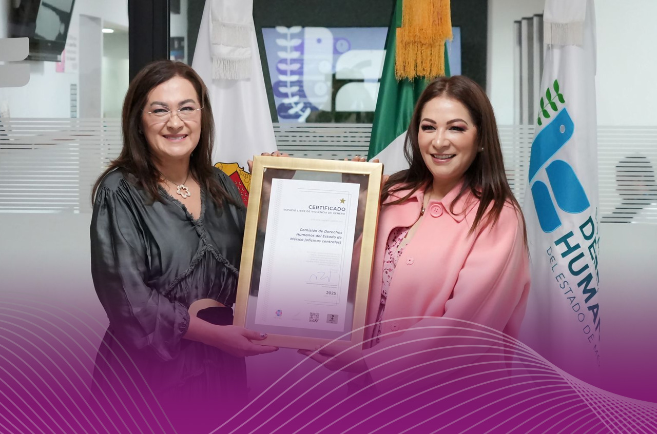 El distintivo fue entregado a la presidenta de la CODHEM, Myrna Araceli García Morón, por la directora general de Hermas, Jaqueline Guadalupe García Vázquez, y por la coordinadora nacional de la certificación, Soledad Enríquez. Durante el acto protocolario también estuvieron presentes integrantes del Consejo Consultivo del organismo.