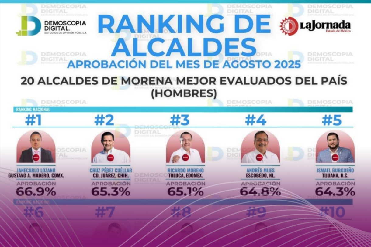 El presidente municipal de Toluca, Ricardo Moreno Bastida, se ubicó en el tercer lugar nacional entre los alcaldes de Morena con mayor nivel de aprobación, según el ranking más reciente elaborado por Demoscopia Digital.