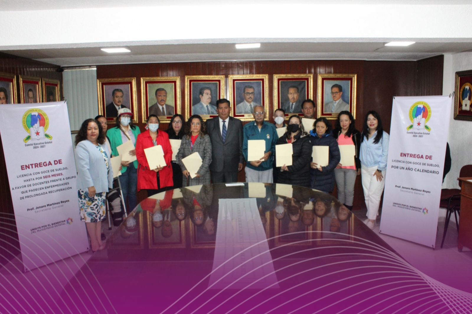 Toluca, Méx.– El Sindicato de Maestros al Servicio del Estado de México (SMSEM), encabezado por su secretario general, Jenaro Martínez Reyes, entregó licencias médicas con goce de sueldo a 12 docentes del subsistema estatal que enfrentan enfermedades graves y requieren una prolongada recuperación.