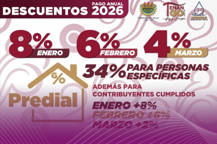 Tenango del Valle, Méx. – El presidente municipal de Tenango del Valle, Roberto Bautista Arellano, informó que su administración puso en marcha el programa de descuentos 2026 en el pago del impuesto predial y del servicio de agua potable. La medida busca incentivar el cumplimiento oportuno de las obligaciones fiscales municipales y fortalecer la recaudación destinada a servicios públicos.