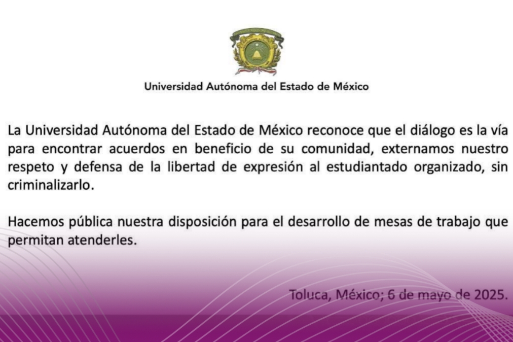 “La UAEMéx reconoce que el diálogo es la vía para encontrar acuerdos en beneficio de su comunidad, externamos nuestro respeto y defensa de la libertad de expresión al estudiantado organizado, sin criminalizarlo.