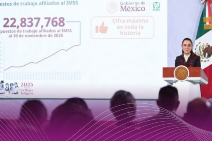 El Gobierno de México informó que, al 30 de noviembre de 2025, el Instituto Mexicano del Seguro Social (IMSS) registró 22 millones 837 mil 768 puestos de trabajo, la cifra más alta desde que existen registros formales en 1997. Del total, 86.7 por ciento corresponde a empleos permanentes, lo que representa 19 millones 800 mil 325 plazas.