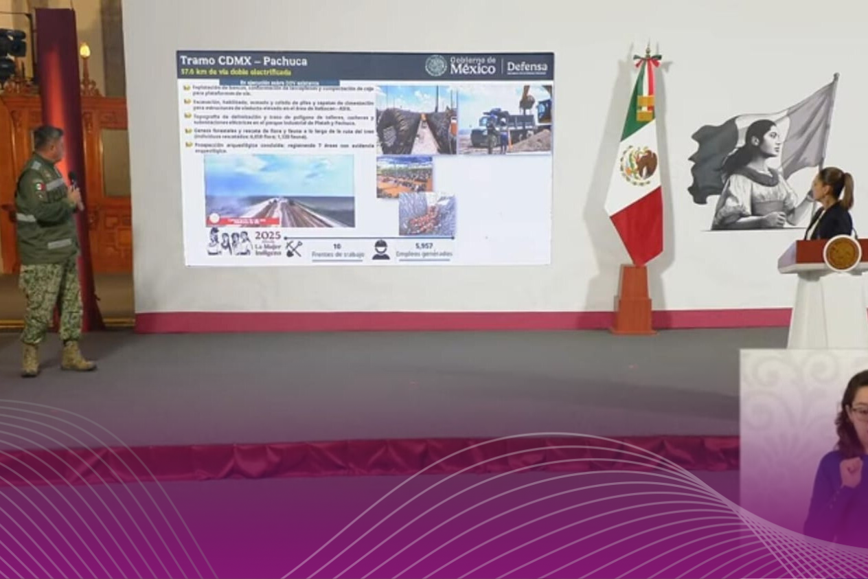 Durante la conferencia mañanera del Gobierno de México, el General Ricardo Vallejo, Comandante del Agrupamiento de Ingenieros “Felipe Ángeles”, presentó los avances de los proyectos ferroviarios prioritarios en el Valle de México.