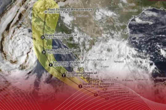 Las autoridades establecieron zona de vigilancia por efectos de tormenta tropical desde Zihuatanejo, Guerrero, hasta Cabo Corrientes, Jalisco. La amplia circulación del ciclón favorece nubosidad densa en el occidente y sur del país, por lo que se pide atender los avisos oficiales y restricciones a la navegación y a actividades en playa.