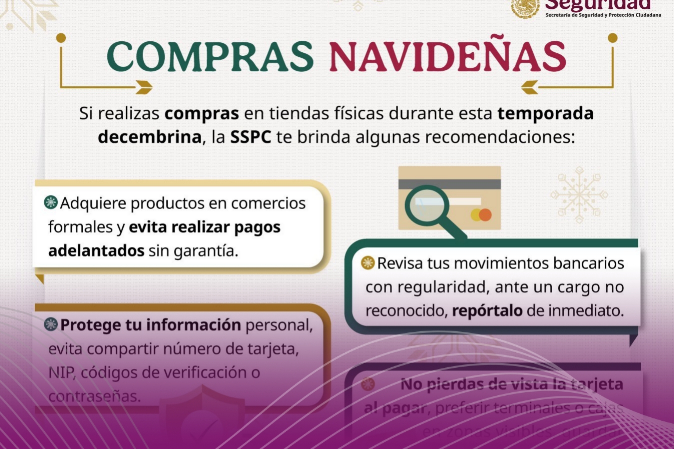 La Secretaría de Seguridad y Protección Ciudadana (SSPC), por medio de la Unidad de Inteligencia, Investigación Cibernética y Operaciones Tecnológicas, difundió una guía de buenas prácticas para prevenir fraudes durante la temporada navideña, periodo en el que aumenta la actividad comercial y turística en el país.