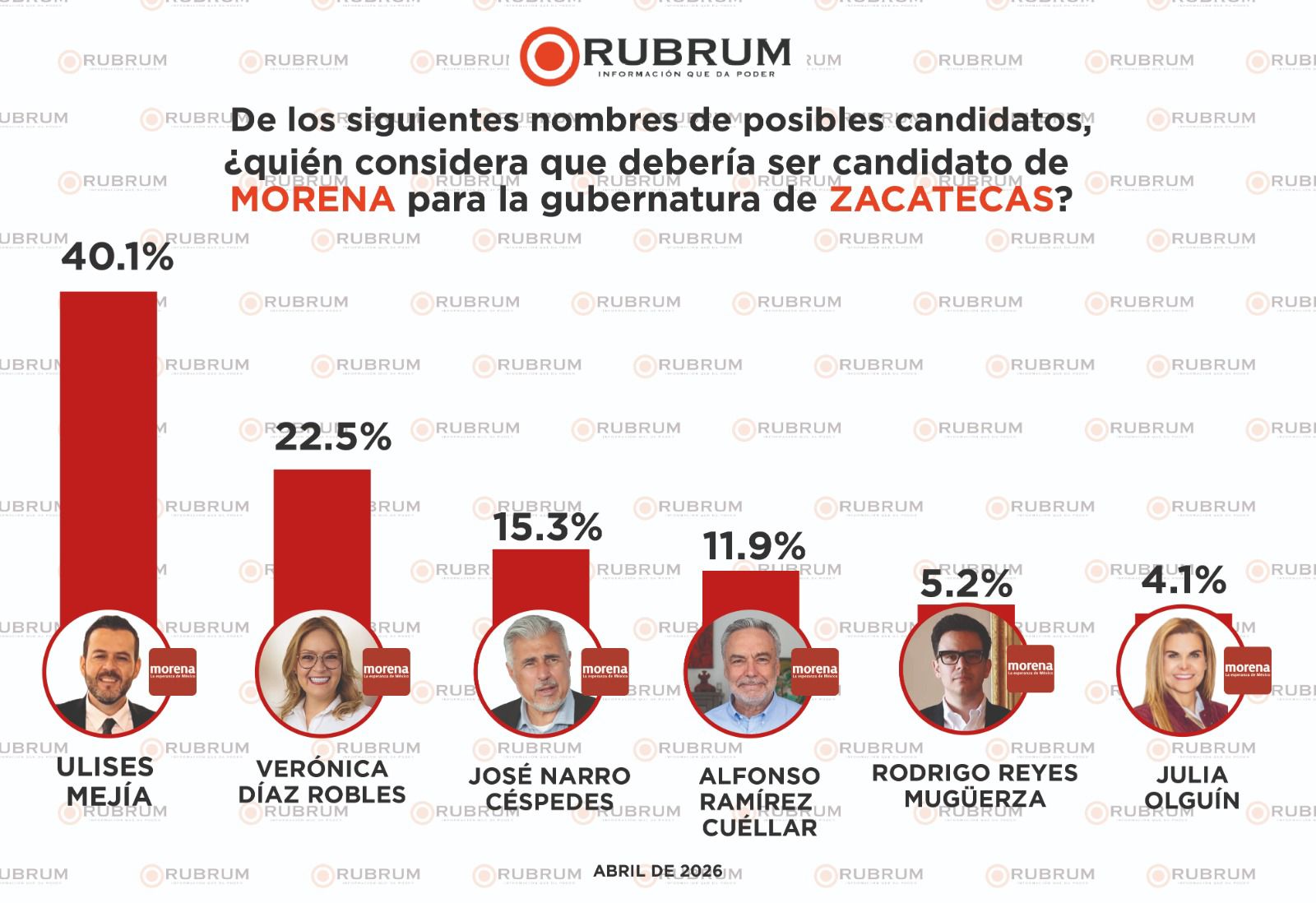 El diputado federal Ulises Mejía Haro se ubica al frente de las preferencias ciudadanas para ser candidato de Morena a la gubernatura de Zacatecas, de acuerdo con una encuesta difundida por la firma Rubrum en abril de 2026.