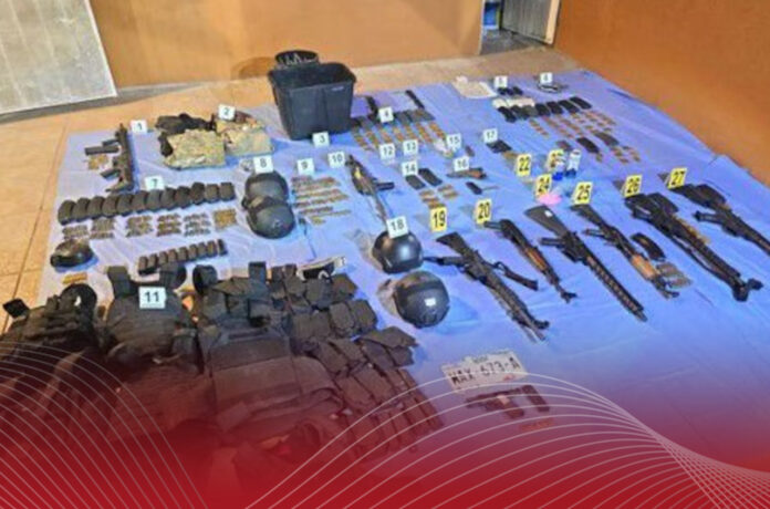 En el lugar fueron detenidos siete hombres y dos mujeres, quienes portaban siete armas largas de distintos calibres, tres armas cortas, 56 cargadores, más de mil cartuchos útiles, una réplica de arma y equipo táctico. También se aseguraron 24 dosis de metanfetamina, un envoltorio de marihuana, cuatro cascos balísticos, objetos ponchallantas metálicos y un vehículo con reporte de robo en Estados Unidos, mismo que portaba placas sobrepuestas del estado de Sonora.
