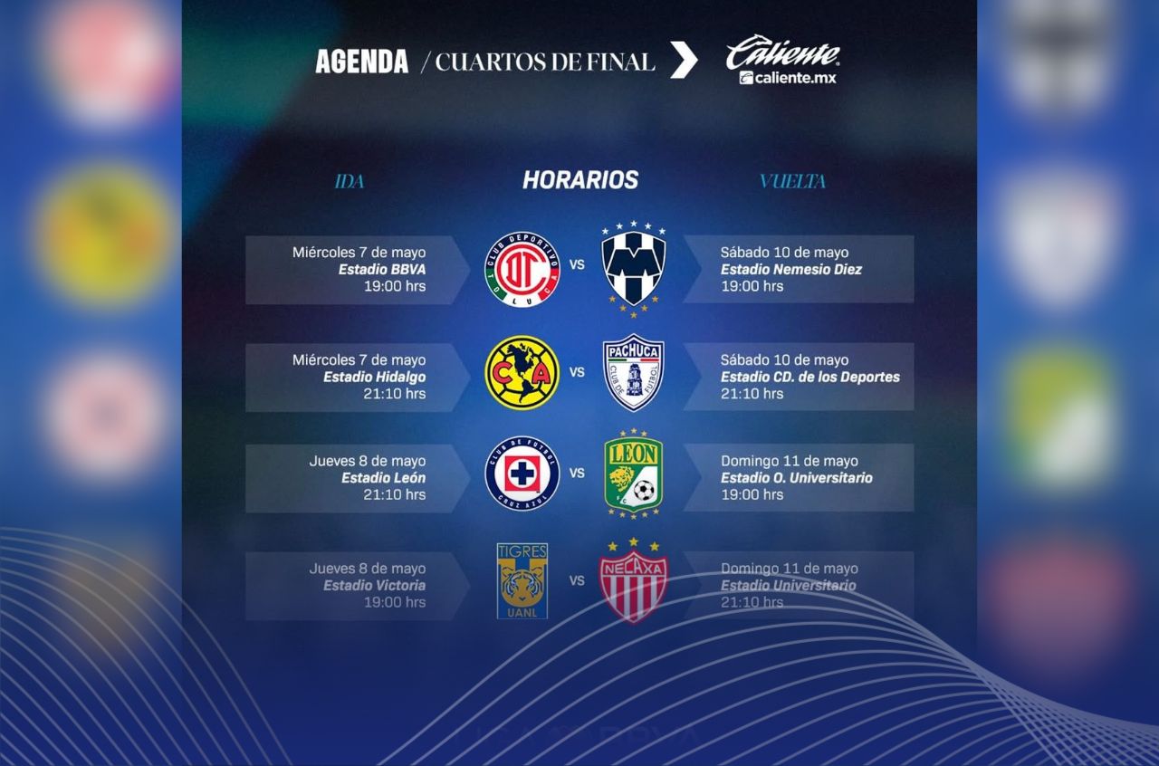 La programación de los encuentros de vuelta está confirmada para el fin de semana del 10 y 11 de mayo. Los equipos recibirán en casa con la esperanza de sellar su boleto a semifinales. El Estadio Nemesio Diez, el Ciudad de los Deportes, el Olímpico Universitario y el Universitario de Nuevo León serán sedes de alta tensión.